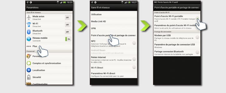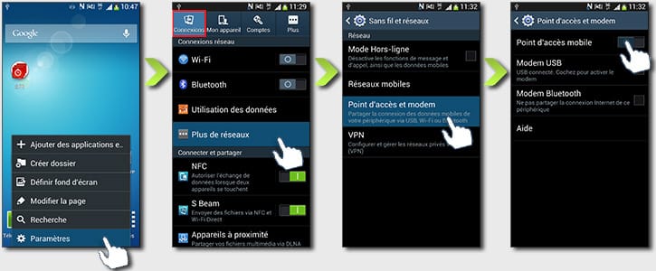 Manipulations sur votre smartphone : Paramètres > Partage du réseau mobile (ou Partage de connexion) > Paramètre connexion USB (vous pouvez aussi choisir choisir l’option Modem par USB) > choisissez un nom de réseau (*) et un mot de passe (**).